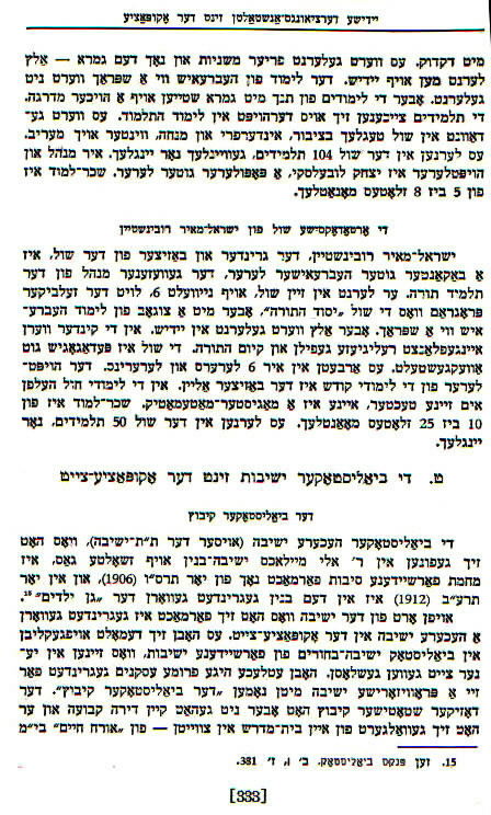 Yisrael Meir Rubisntein, founder and chairman of the school, is a well-known, good Hebrew teacher, the former director of the talmud torah. In his school, at Niewelt(st.?) 6, he teaches the same program as in the "Yesod hatorah" school, but with an emphasis on the teaching of Hebrew as a language. But everything is taught in Yiddish. In the children, religious sentiment is combined with Kiyum ha-torah. the synagogue is well-founded pedagogically. Six male and female teachers work there. The head teacher for Limudei Kodesh is the chairman himself. In the Limudei Chol he is aided by his daughters, one with an MA in mathematics. Tuition is 10-25 Zlotes a month. There are 50 pupils in the school, all young boys.